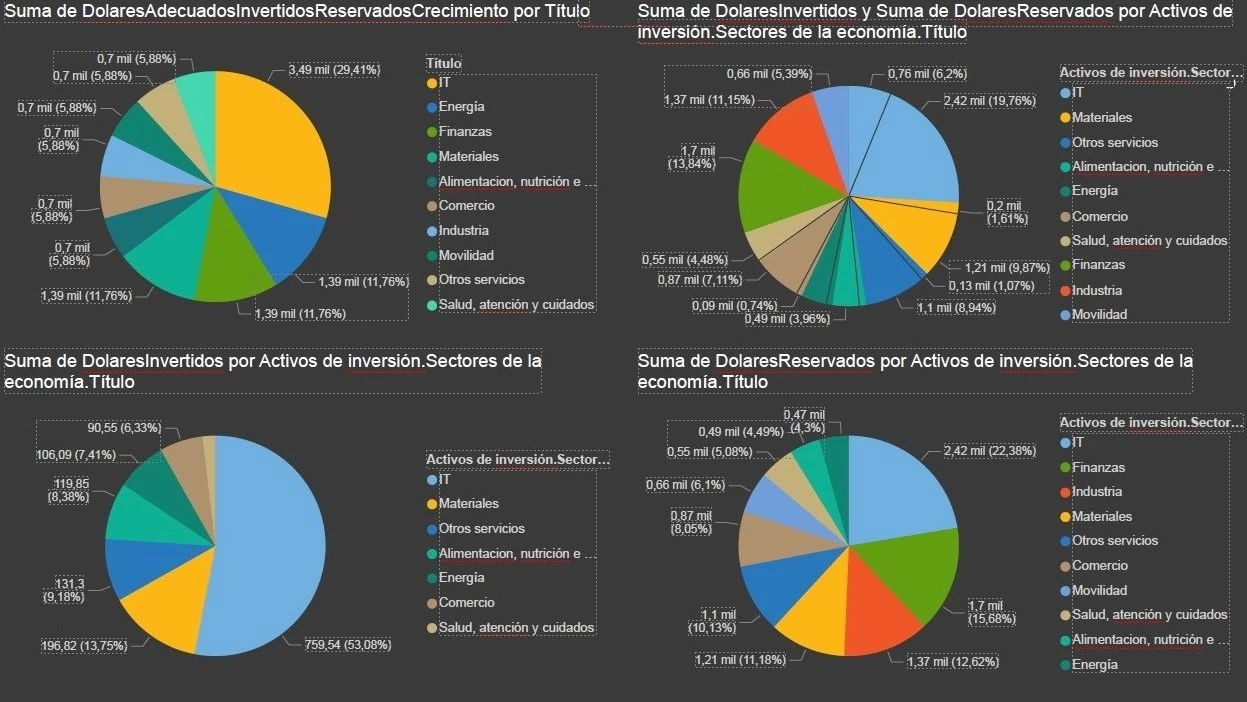 Hacemos informes y cuadros de mando que permiten tener a mano toda la información necesaria para tomar decisiones, como este informe en el que se representa visualmente el reparto de capital en un portfolio de inversión financiera.